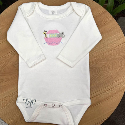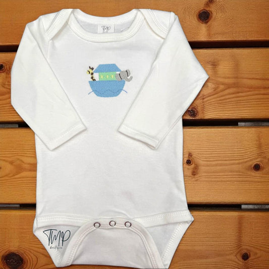 Embroidered Noah's Ark Baby Bodysuit, Personalized Cotton, Long Sleeve