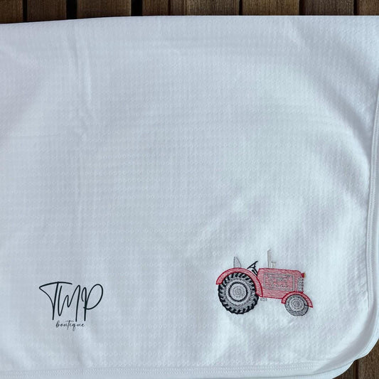 Embroidered Red Tractor Baby Blanket Set: Jacquard Cotton Farm Gift