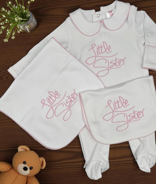 Embroidered Little Sister Outfit: Baby Girl Footie, Bib & Burp Cloth