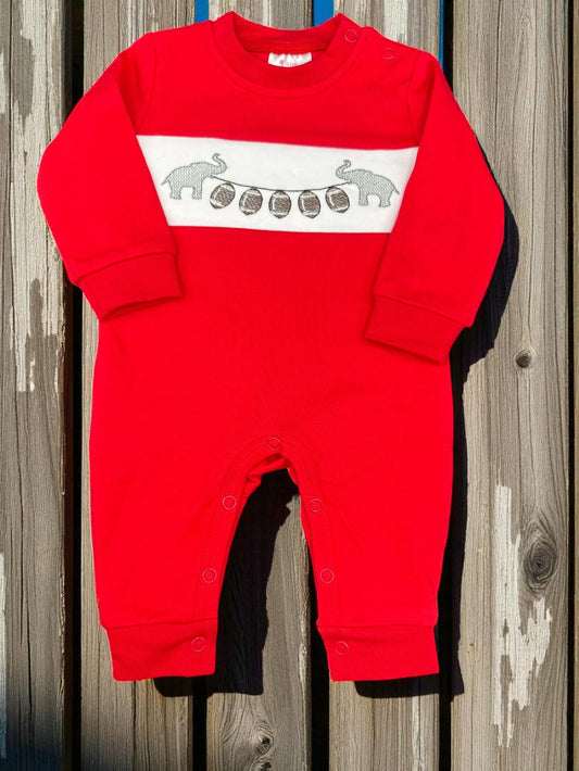 Embroidered Elephant Football Romper: Red Cotton Baby Game Day Outfit