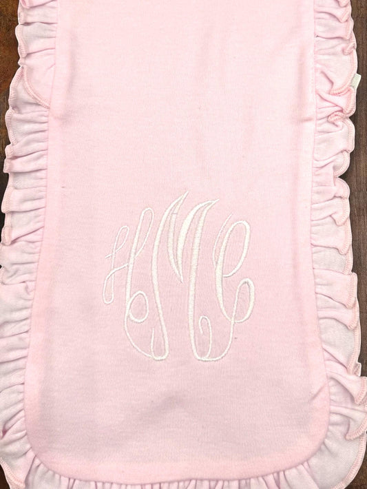 Monogrammed Baby Bib and Burp Cloth Set: Pink or Lavender Ruffle