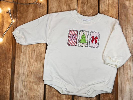 Christmas Embroidered Baby Romper, Long Sleeve Holiday Outfit, Baby’s First Christmas, Christmas Tree & Bows, Bubble, Christmas Pictures