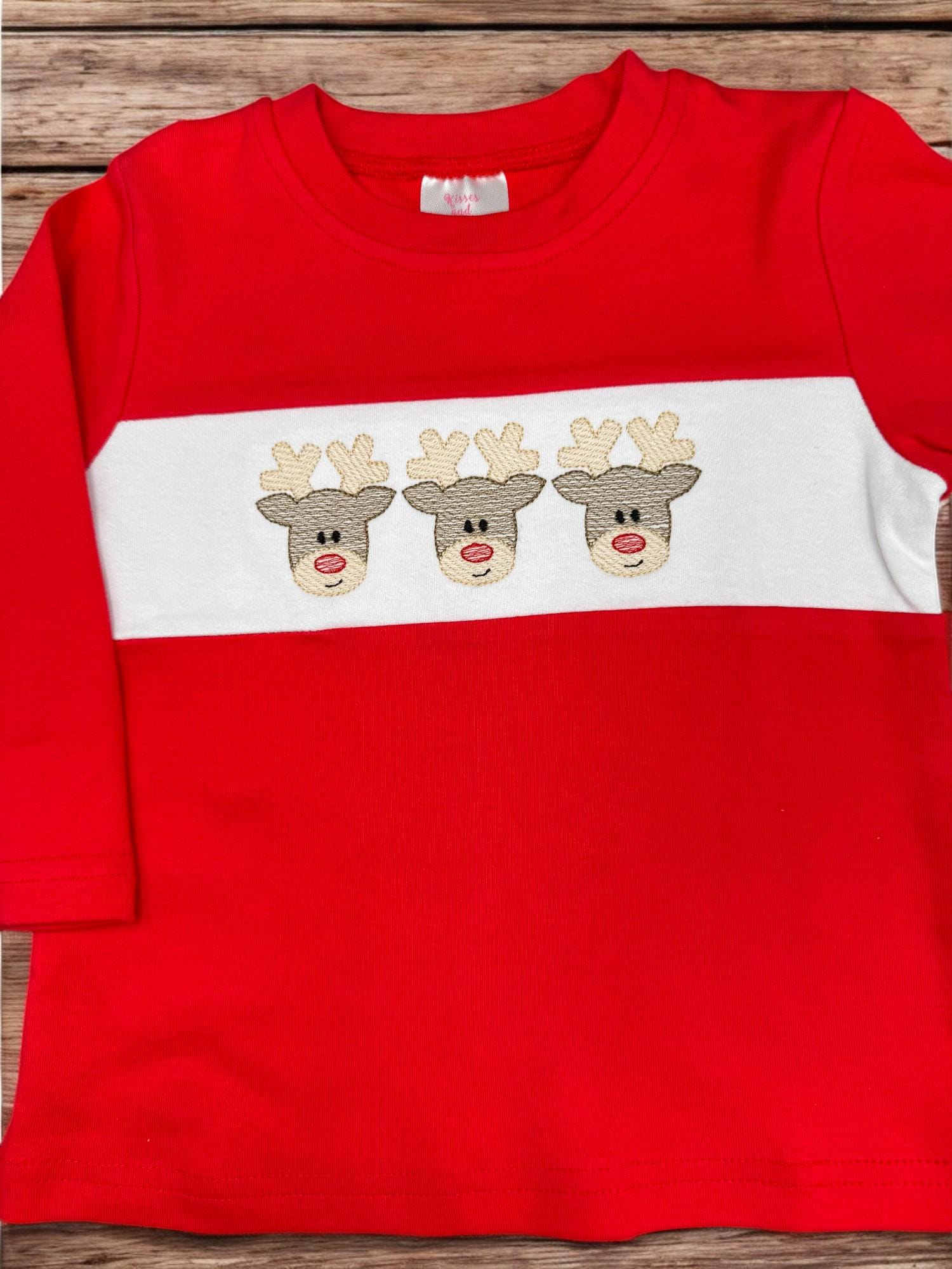 Boys Christmas Reindeer Shirt: Embroidered Red Long Sleeve
