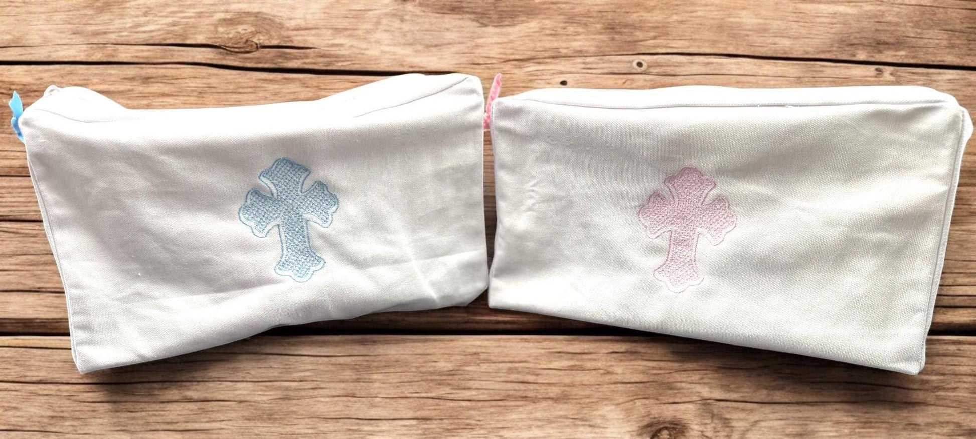 This beautifully embroidered white canvas zipper pouch is perfect for meaningful gifting and everyday use. Featuring a delicate cross in your choice of light blue or soft pink, it’s a thoughtful option for baby showers, baptism gifts, church events, or keepsake gift sets.