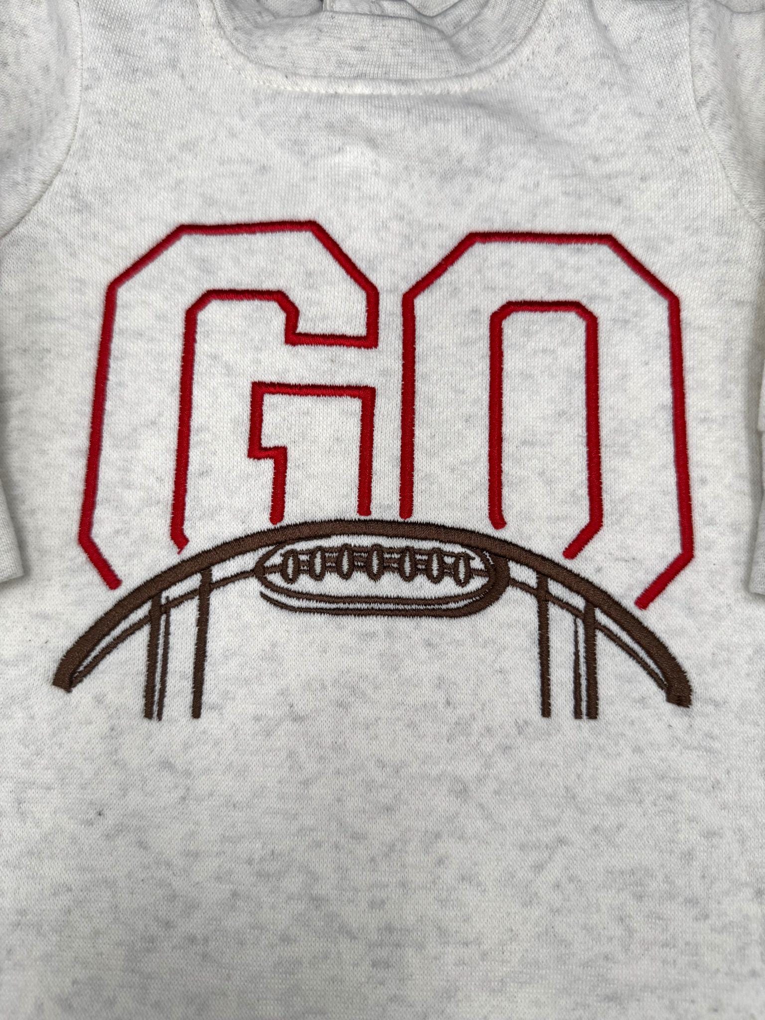 Get your little fan ready for football season with this cozy embroidered romper! Featuring bold “GO” lettering with a football & goal post detail, this one-piece is the perfect outfit for cheering on game day. Soft fleece fabric keeps baby warm and comfy, while easy snap tape closures make changes a breeze.