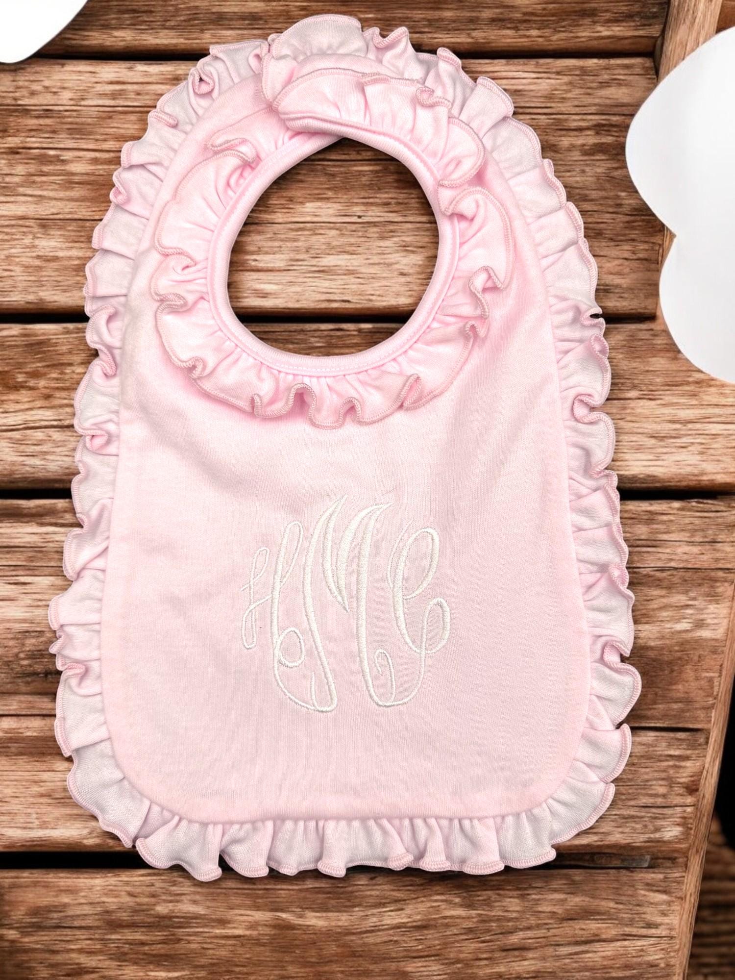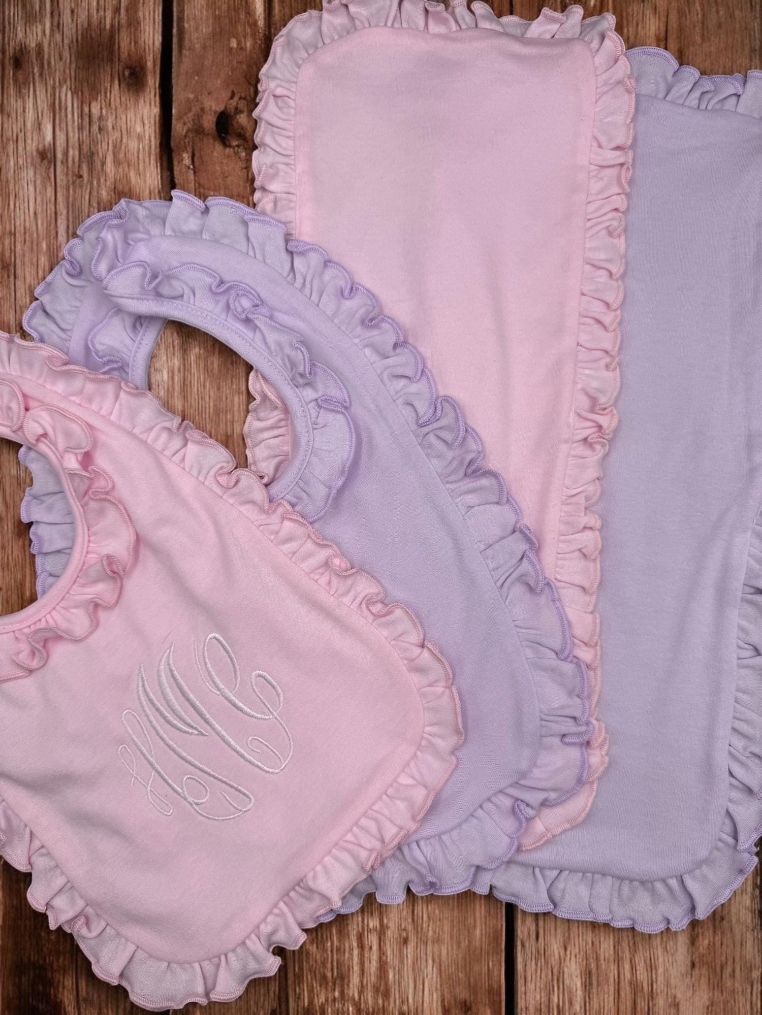 Monogrammed Baby Bib and Burp Cloth Set: Pink or Lavender Ruffle