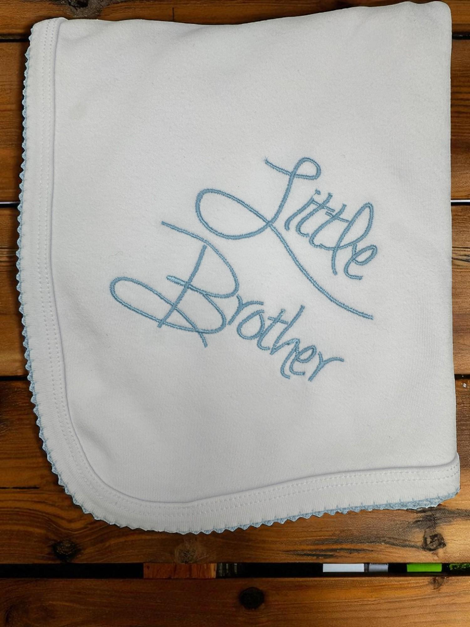 • Embroidered “Little Brother” in light blue thread